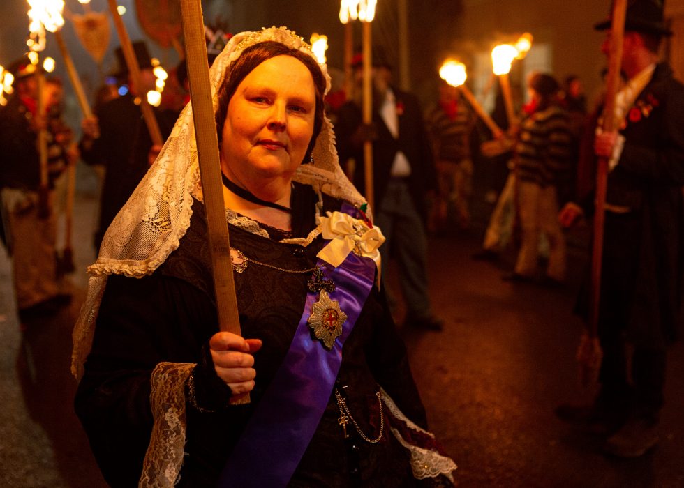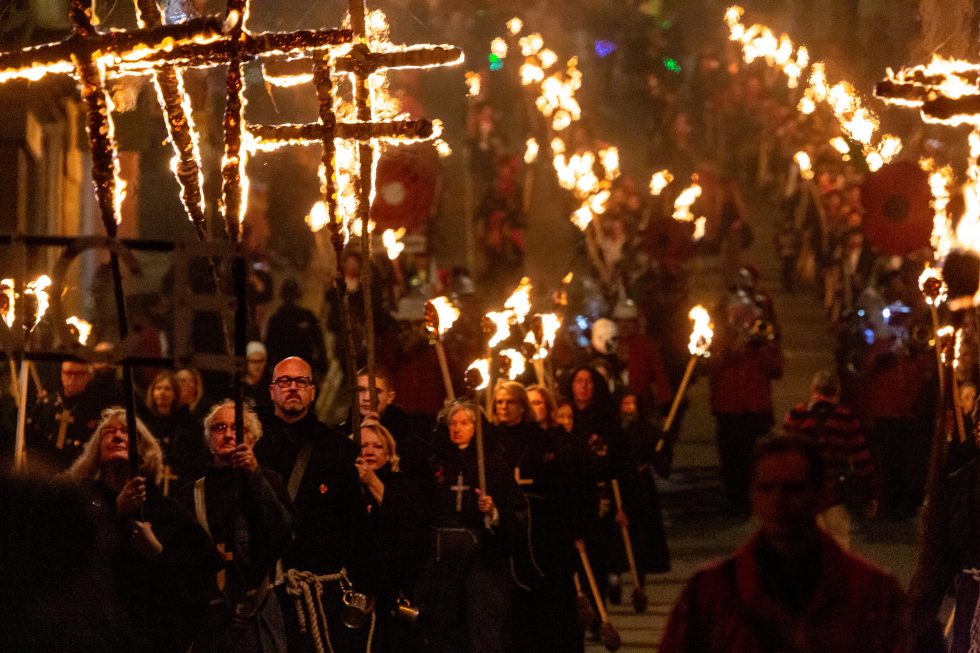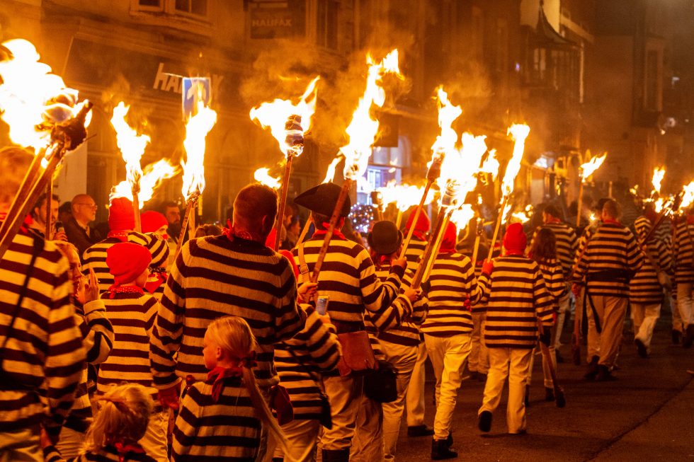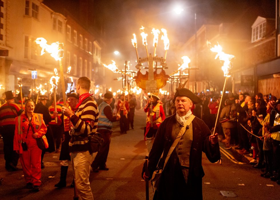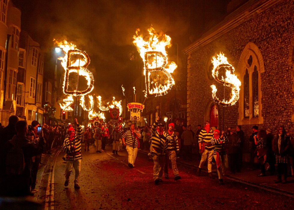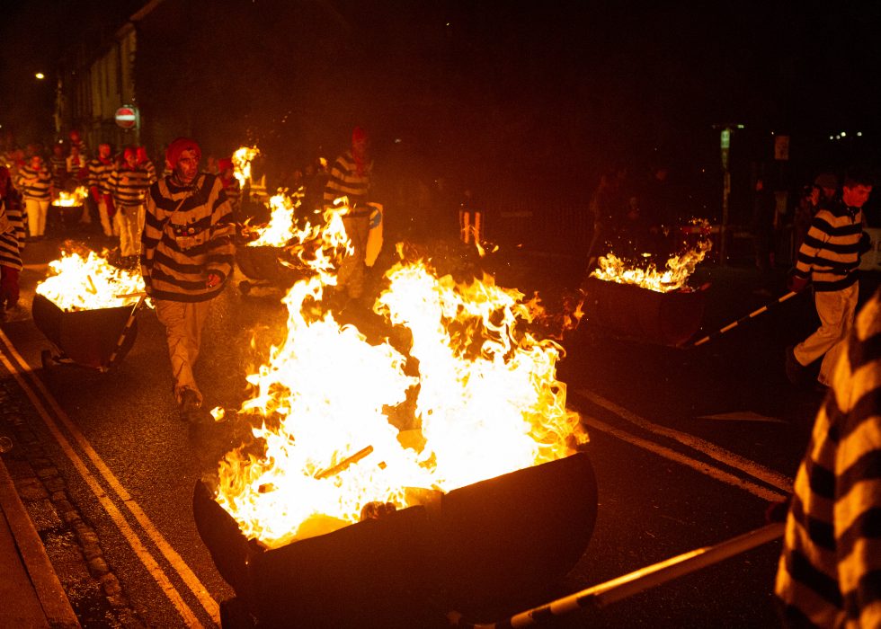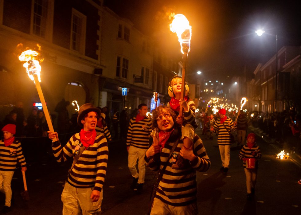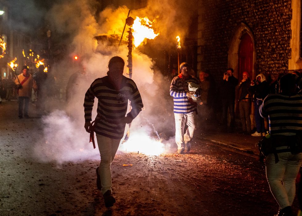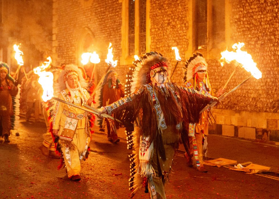 Lewis bon fire celebrations are like morris dancers meet Mad Max. The bonfire societies parade through the streets holding burning torches & crucifixes, burning effigies and letting off powerful bangers. They do all this dressed in all manner of costumes from monks, pearly Kings & Queens, Native Americans, Tudors, 1st & 2nd World War Solders and more.