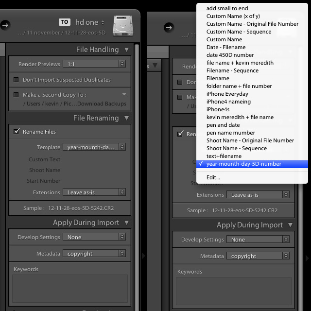 Once you have made a preset you can easily reuse it on your next import by selecting it from the File Renaming dialog on the left of the import screen.