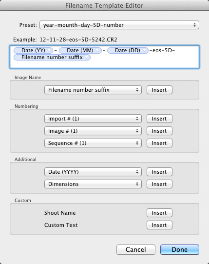 In the Filename Template Editor you can start to put together your custom file name using the drop downs and insert buttons. Once you’re done you can save it as a preset by clicking the top drop down menu and choosing “Save Current Preset as New Preset”.