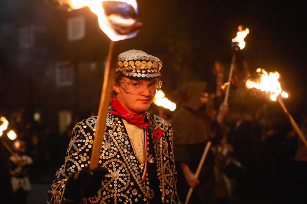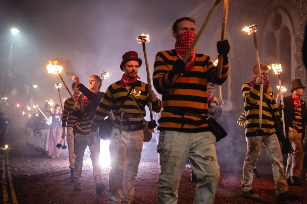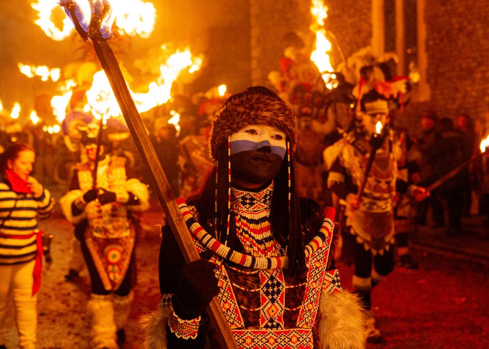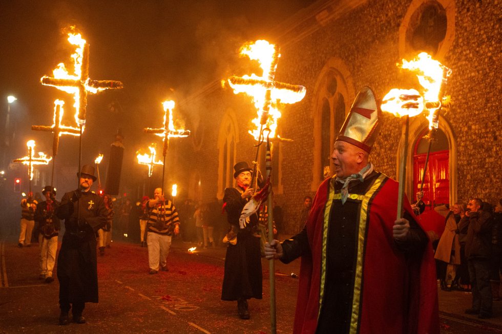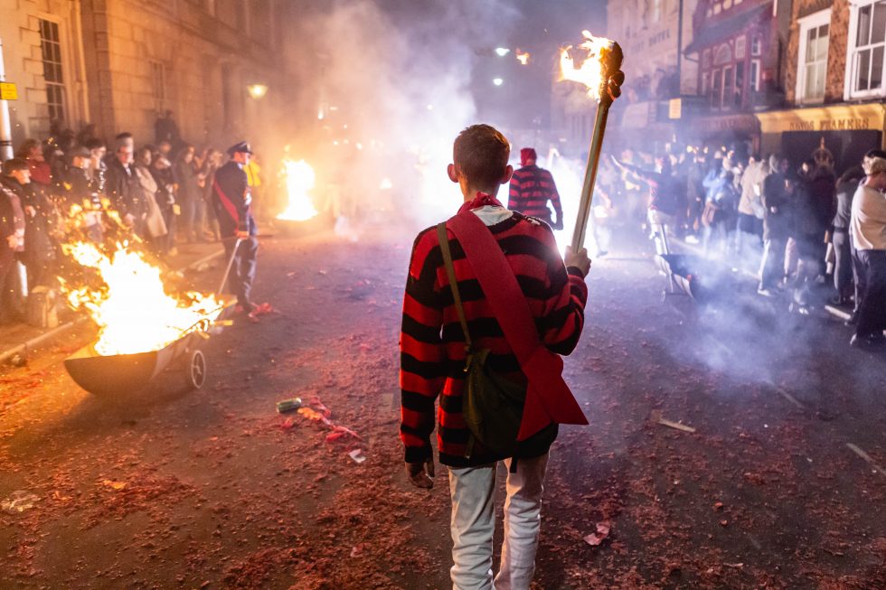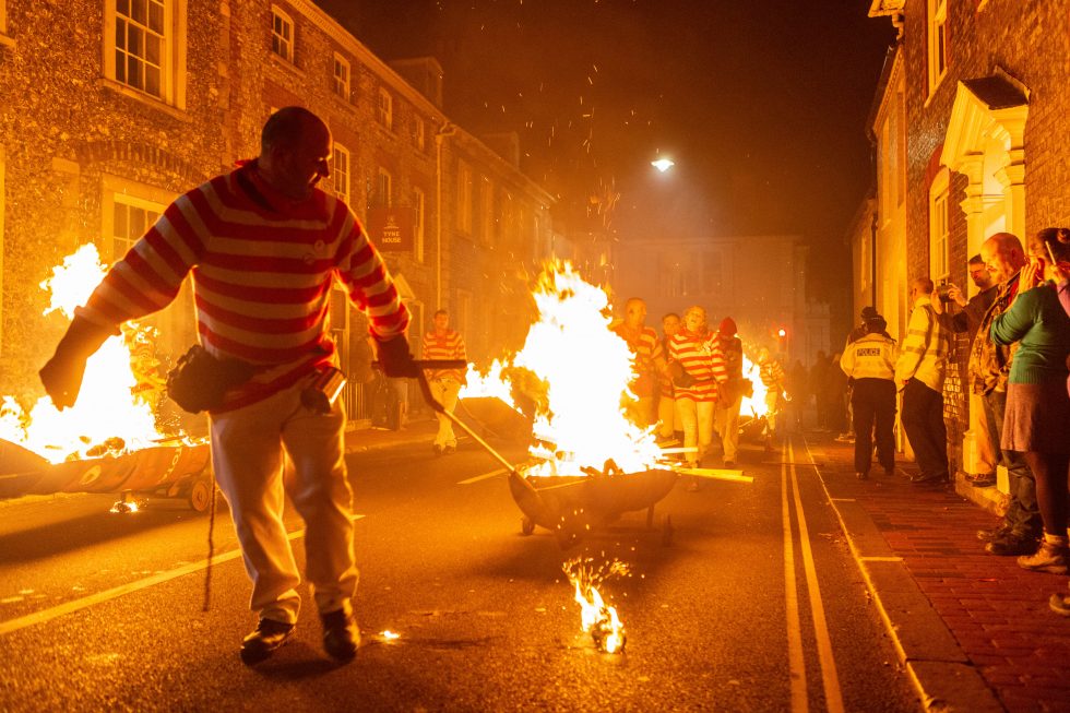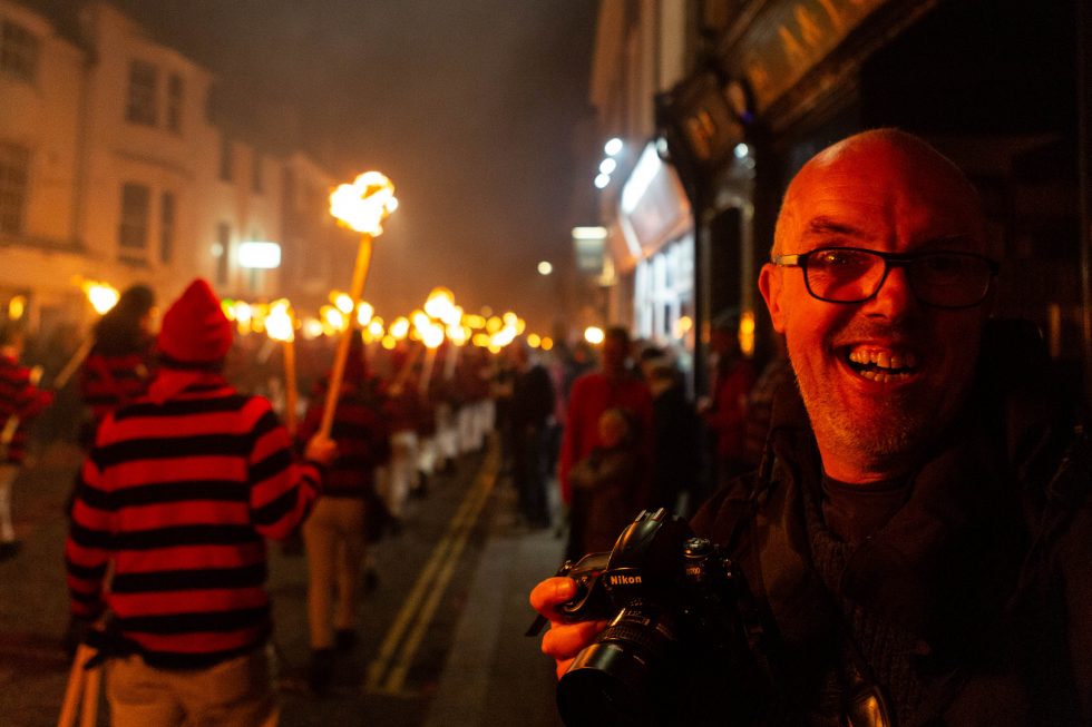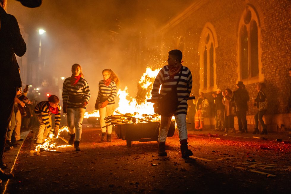 Every year on the 5th of November Lewes a small town in Sussex goes bonfire mad. Bonfire societies descend on Lewes from the surrounding areas and parade though the streets with fire torches, effigies and burning crosses. They do all this dressed in all manner of costumes 1st & 2nd World War solders, tudors, catholic clergy, American civil war solders and more. It’s a crazy mix. Burning crosses (seen in groups of 17) represent 17 Protestants burned at the stake in the town in 1500s by Catholics. As each bonfire procession goes past they discard their not so bright but still burning torches to the ground, and these sometimes pile up into little mini fires. At the back of the procession people (sometimes children) pick up all the burning debris and place it in barrels that are then dragged behind the procession. The fires in these barrels can get quite big. It all adds to the bonkers element of the whole event! This selection of images is from November 5th 2018 & 2019.
