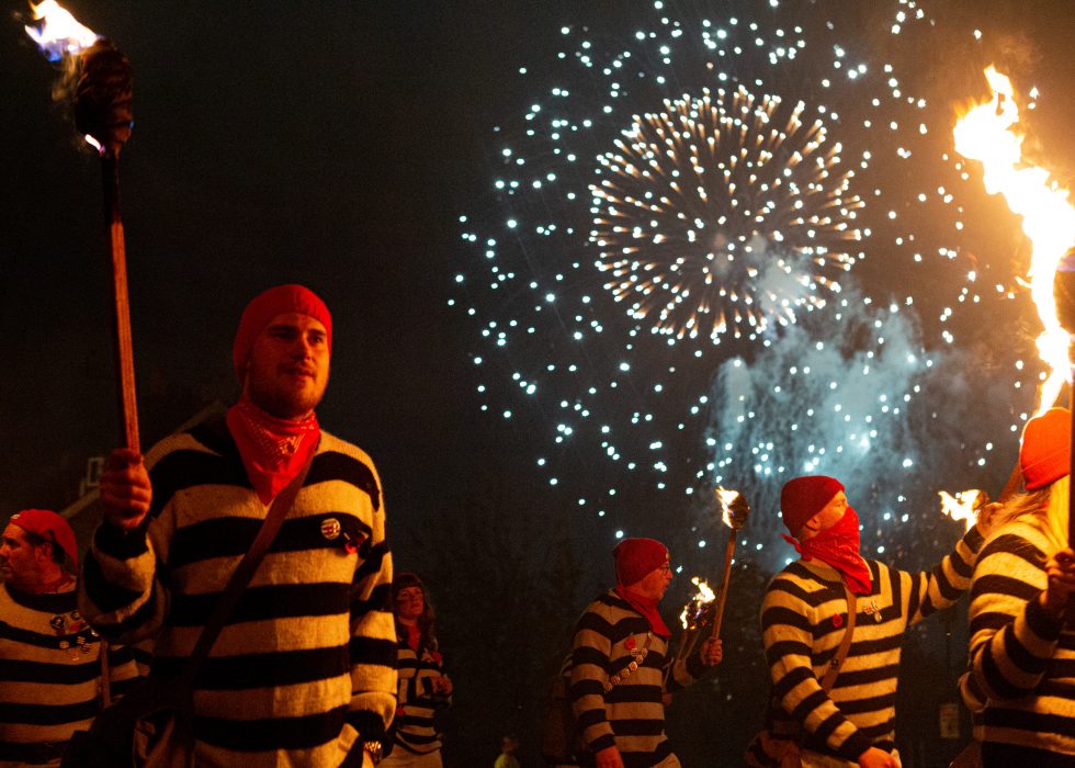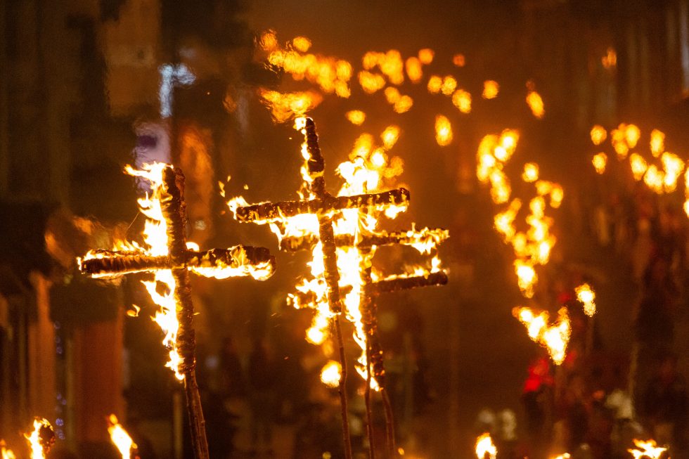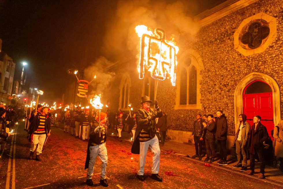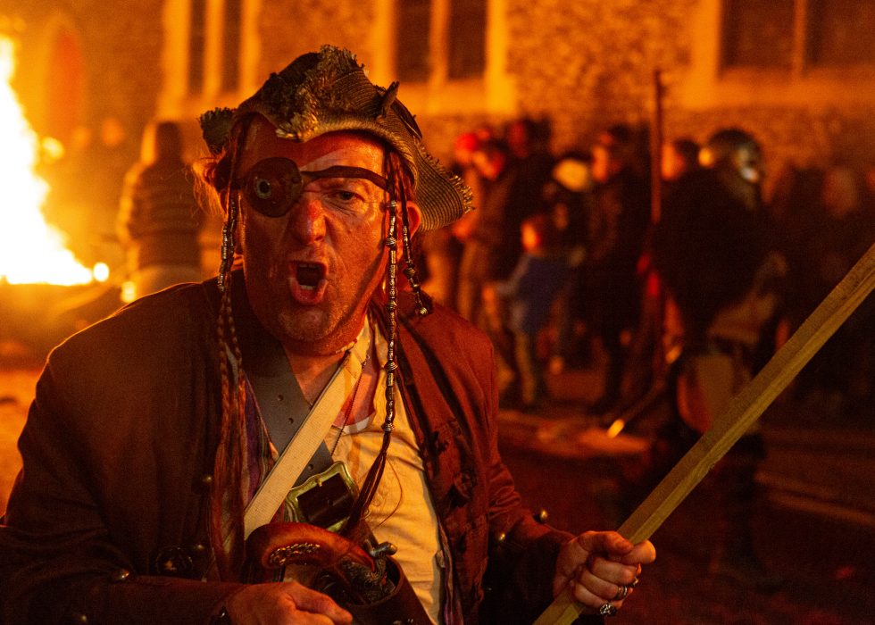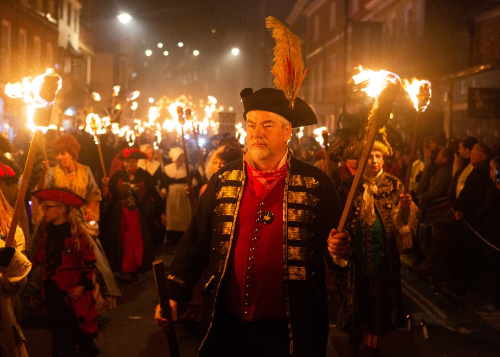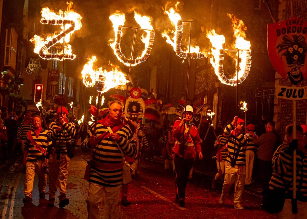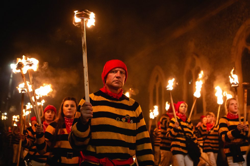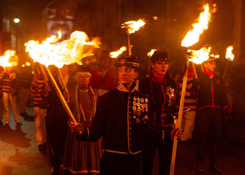 Every year on the 5th of November Lewes a small town in Sussex goes bonfire mad. Bonfire societies descend on Lewes from the surrounding areas and parade though the streets with fire torches, effigies and burning crosses. They do all this dressed in all manner of costumes 1st & 2nd World War solders, tudors, catholic clergy, American civil war solders and more. It’s a crazy mix. Burning crosses (seen in groups of 17) represent 17 Protestants burned at the stake in the town in 1500s by Catholics. As each bonfire procession goes past they discard their not so bright but still burning torches to the ground, and these sometimes pile up into little mini fires. At the back of the procession people (sometimes children) pick up all the burning debris and place it in barrels that are then dragged behind the procession. The fires in these barrels can get quite big. It all adds to the bonkers element of the whole event! This selection of images is from November 5th 2018 & 2019.